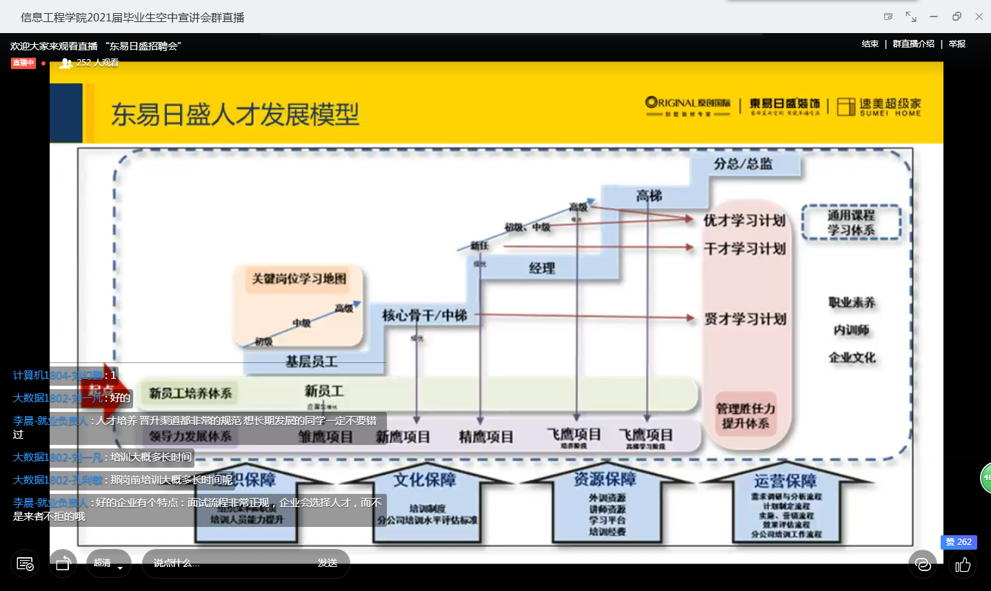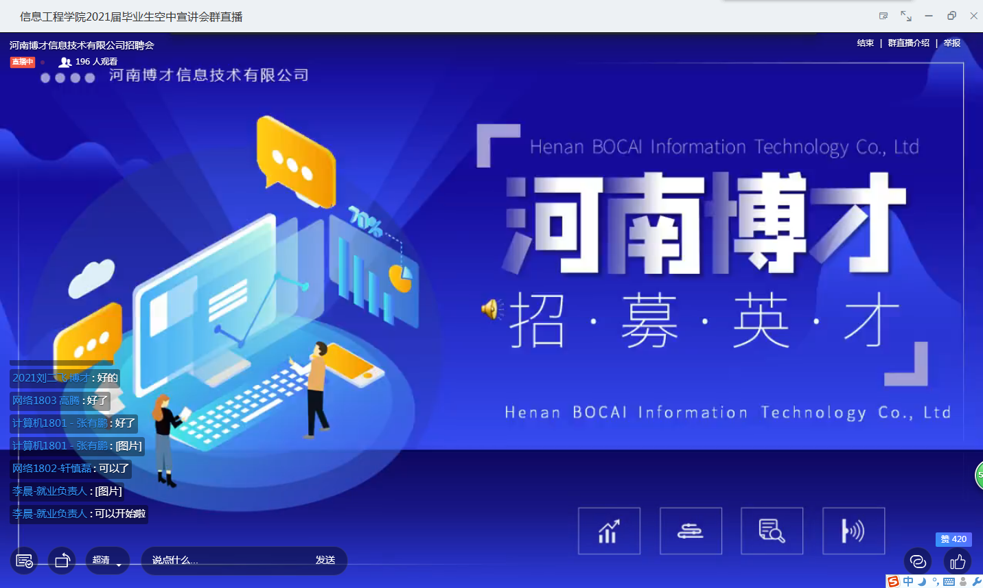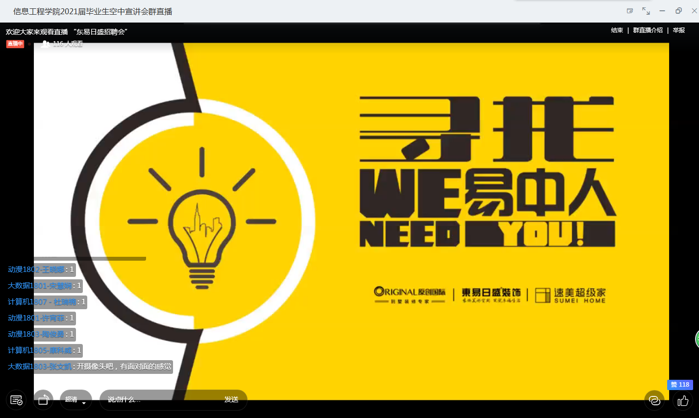 信息工程学院”空中宣讲会“开播近一周以来,反响热烈,日平均3场,为同学们疫情下的求职就业提供了有力保障。5月21日、5月22日两天更是每天4场连播,涉及“网络通讯”、“装饰家居”、“教育科技”、“数字产业园”等多个方面。