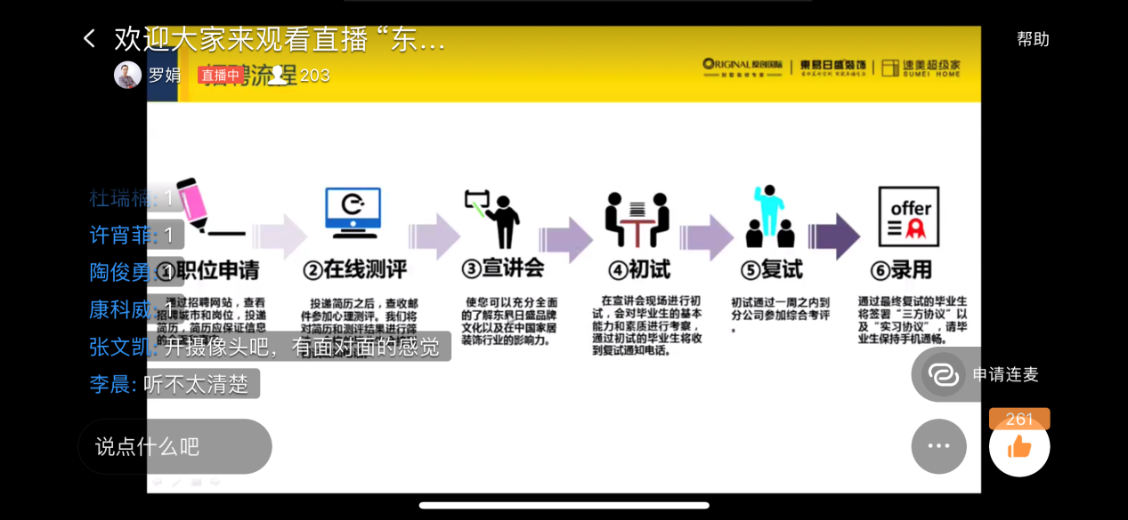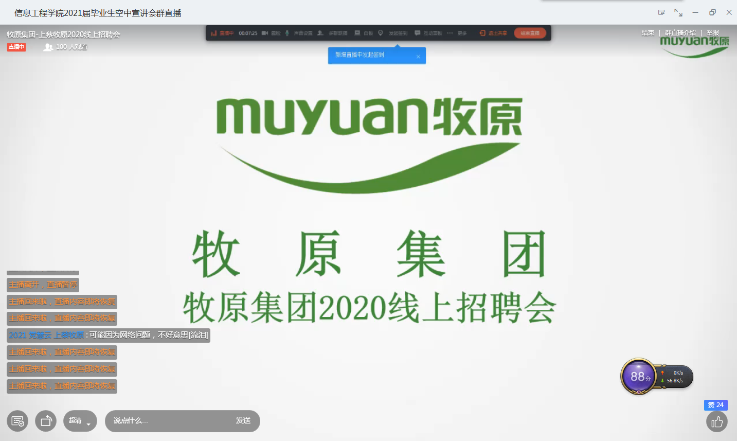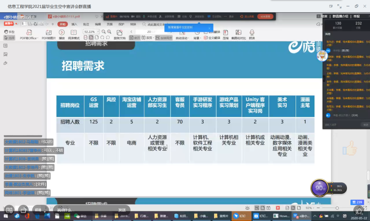 信息工程学院”空中宣讲会“开播近一周以来,反响热烈,日平均3场,为同学们疫情下的求职就业提供了有力保障。5月21日、5月22日两天更是每天4场连播,涉及“网络通讯”、“装饰家居”、“教育科技”、“数字产业园”等多个方面。