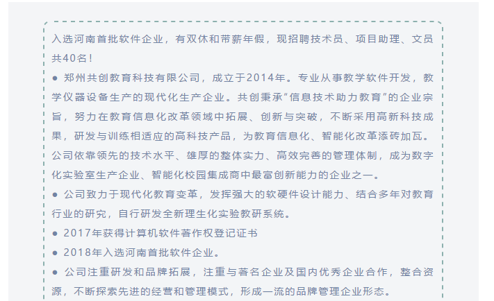 河南首批软件企业,有双休和带薪年假,现招聘技术员、助理、文员共40名!