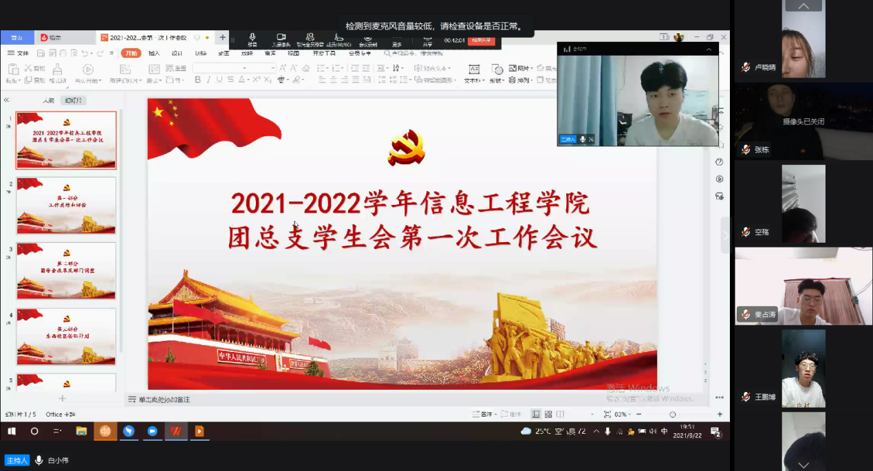2021年9月22日晚上19:30,信息工程学院团总支学生会新学期首次线上干部会议顺利进行。本次会议主要就疫情常态化下学院团学干部政治素养提升、新学期开学疫情防控,新学期工作计划等工作注意事项展开,本次会议采取线上会议的方式进行。参加此次会议的有信息工程学院团总支书记赵源以及信息工程学院团总支学生会主席团成员、全体学生干部及成员。