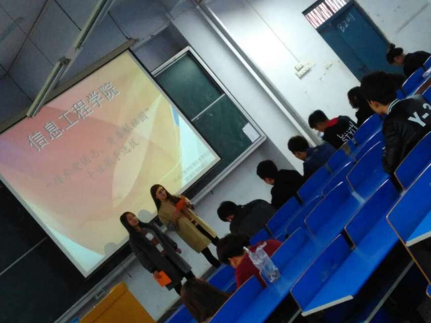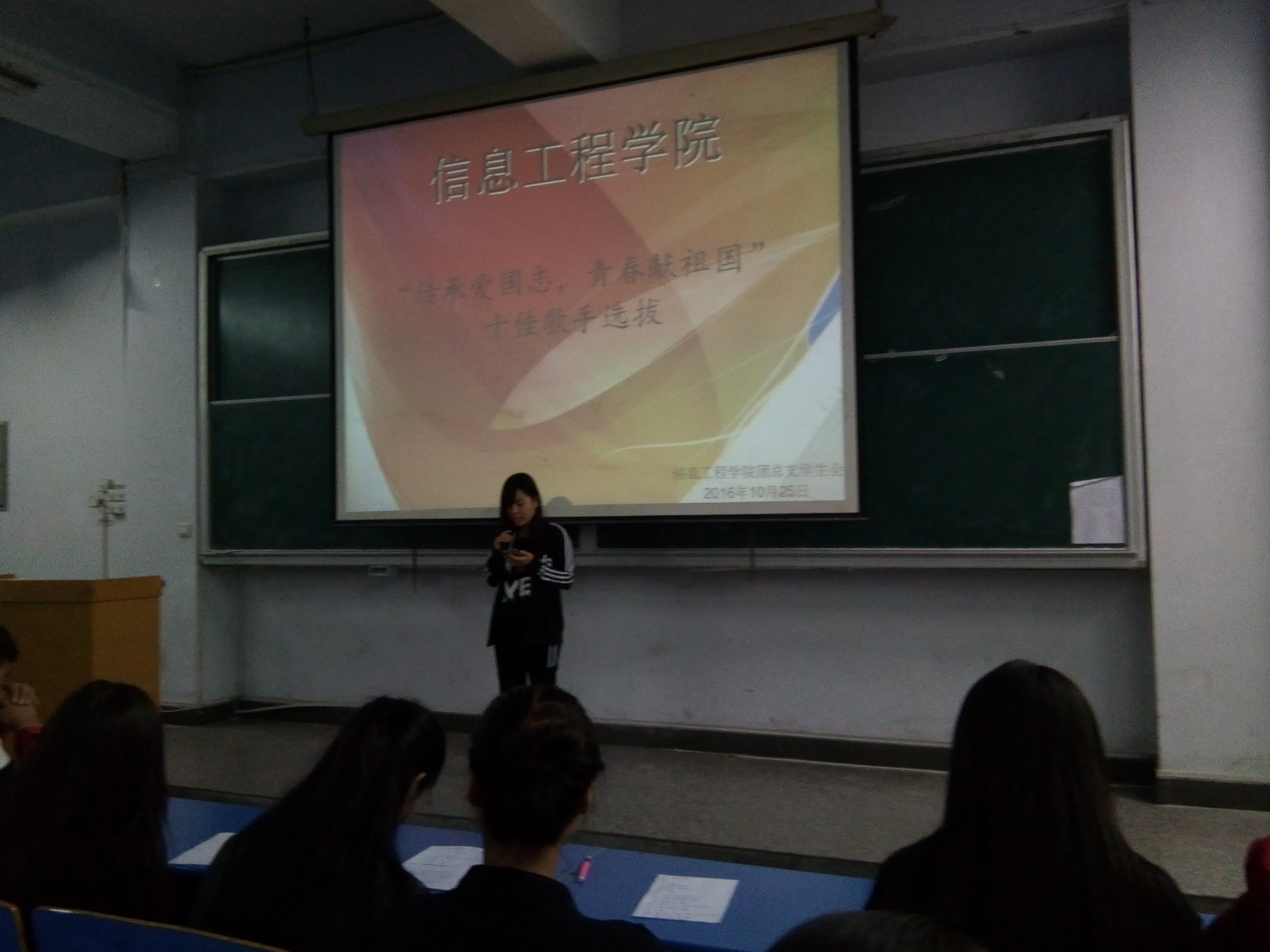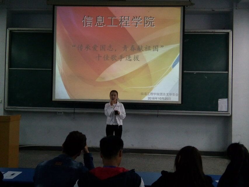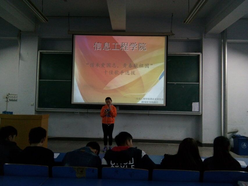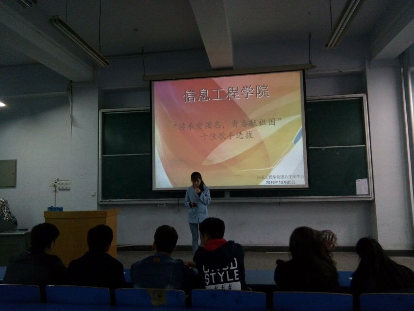 2016年10月25日下午我们信息工程学院在B楼开展了:“十佳歌手选拔”大赛的初选活动。在活动中同学们积极参与,台上的选手认真参与比赛,歌声嘹亮充满热情,台下的同学们也给予了很大的鼓励,充分体现出了同学们的参赛热情和对大学生活的热爱。