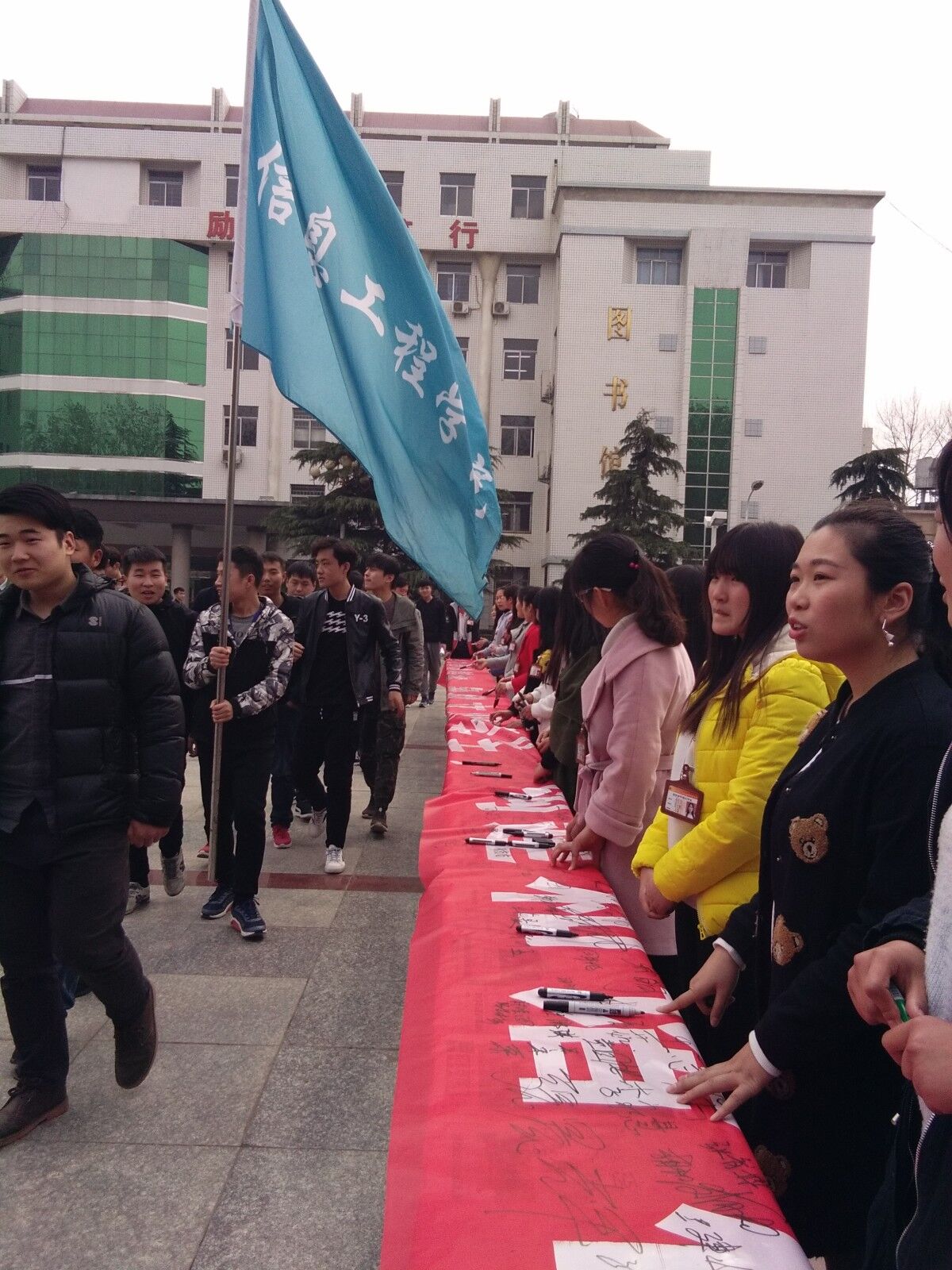随后在红色横幅上我院学生一一签下自己的姓名。标志着三月的文明礼貌月活动正式开启。