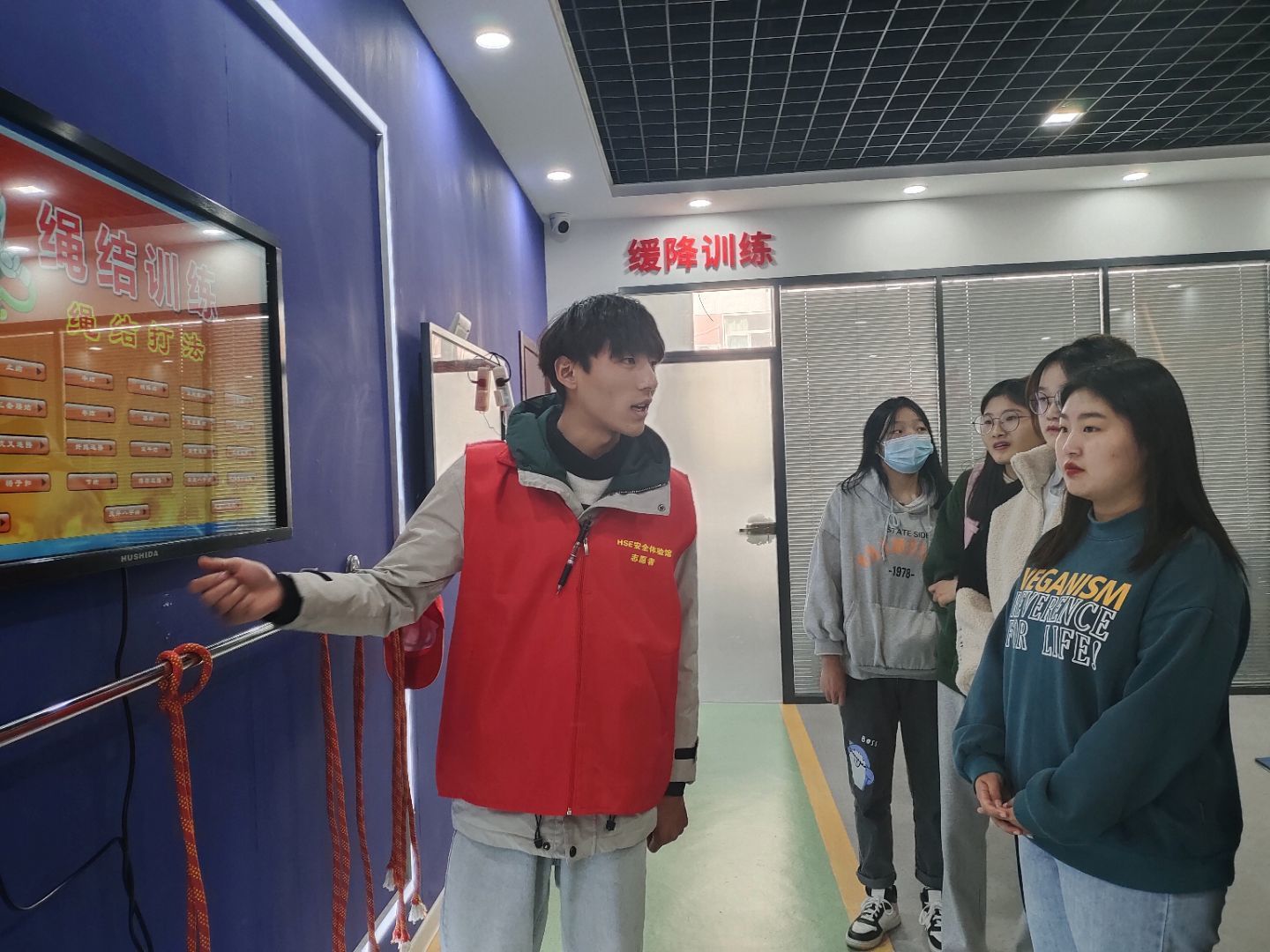 第三项:烟雾逃生和结绳,让同学们在紧急情况下明白如何正确使用结绳对自己进行施救,从根本上让同学们锻炼其自救能力。