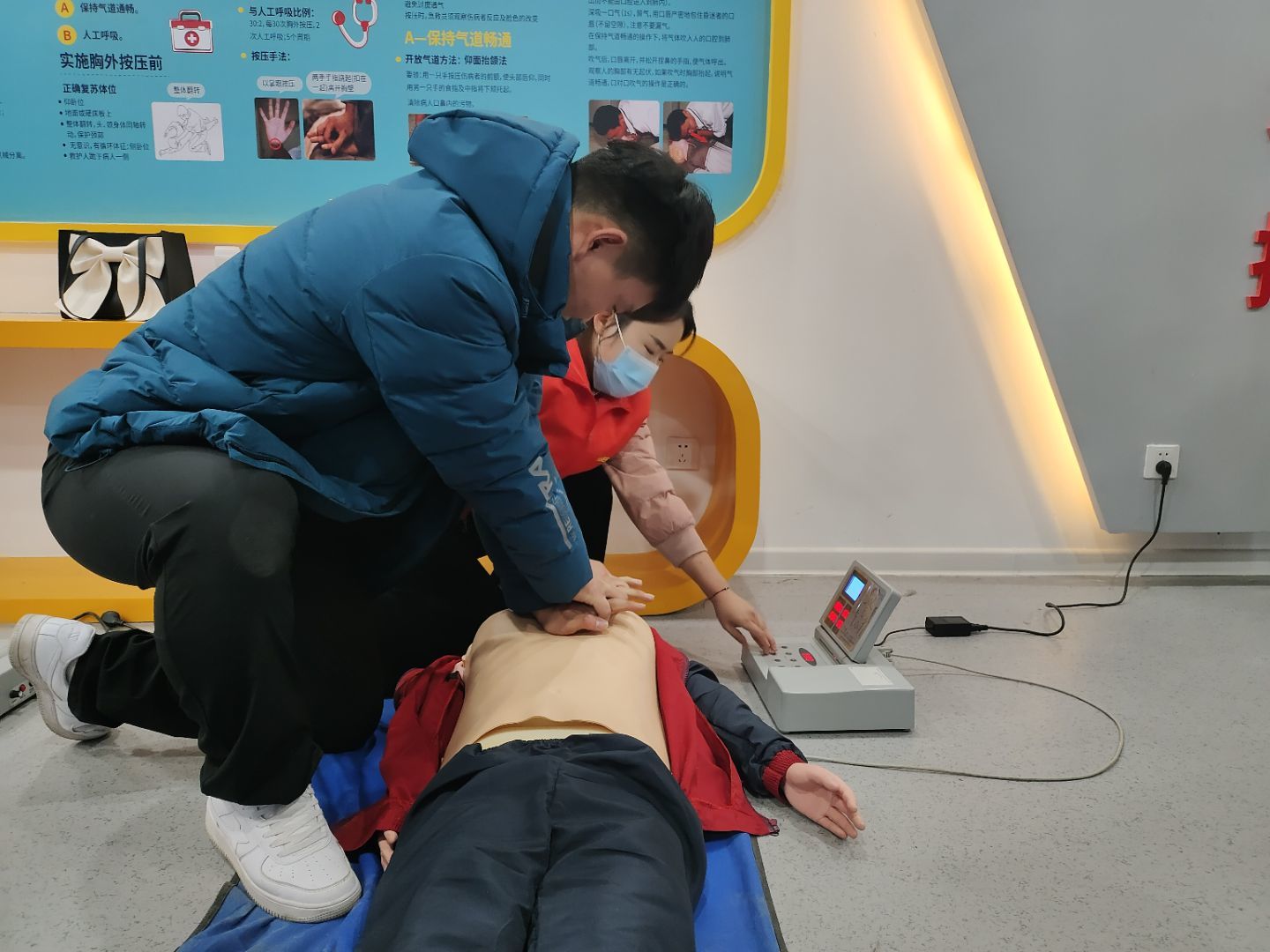 第六项:观看心肺复苏的应急处理示范,在现场解说和实操演练的双重配合下让同学们更加清楚了解心肺复苏的正确操作,以提高自身的应急救济能力,同学们兴致高涨,认真学习心肺复苏的知识。体验馆内同学们积极踊跃的体验各种设备,参与安全隐患的寻找。
