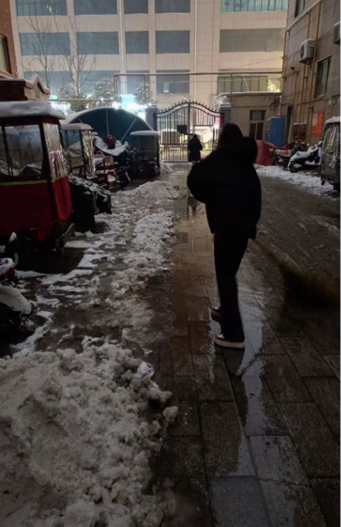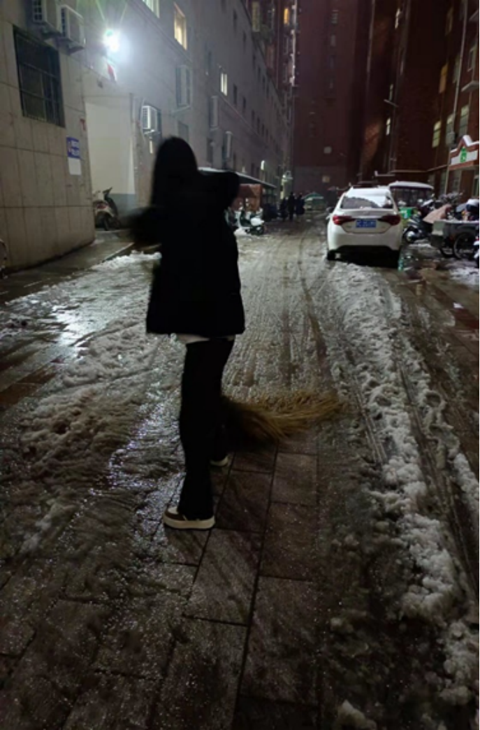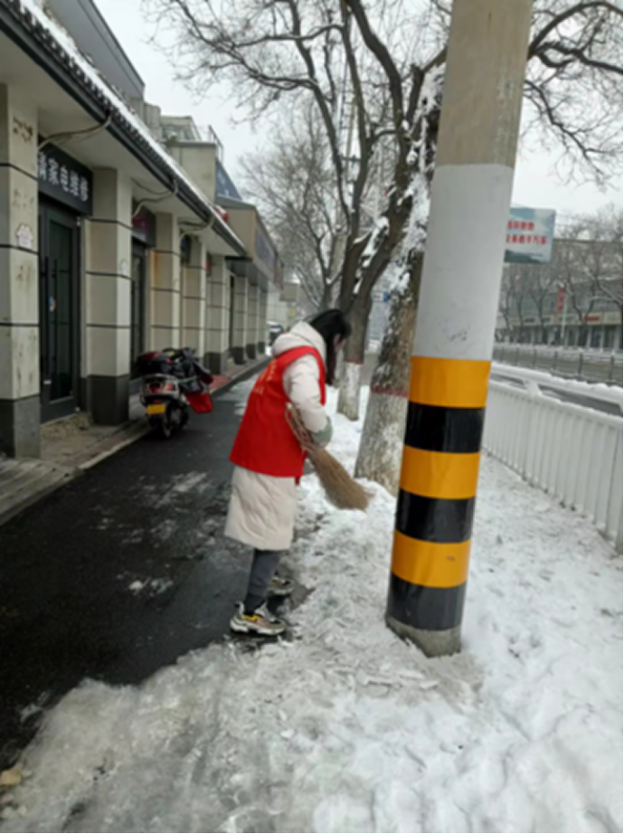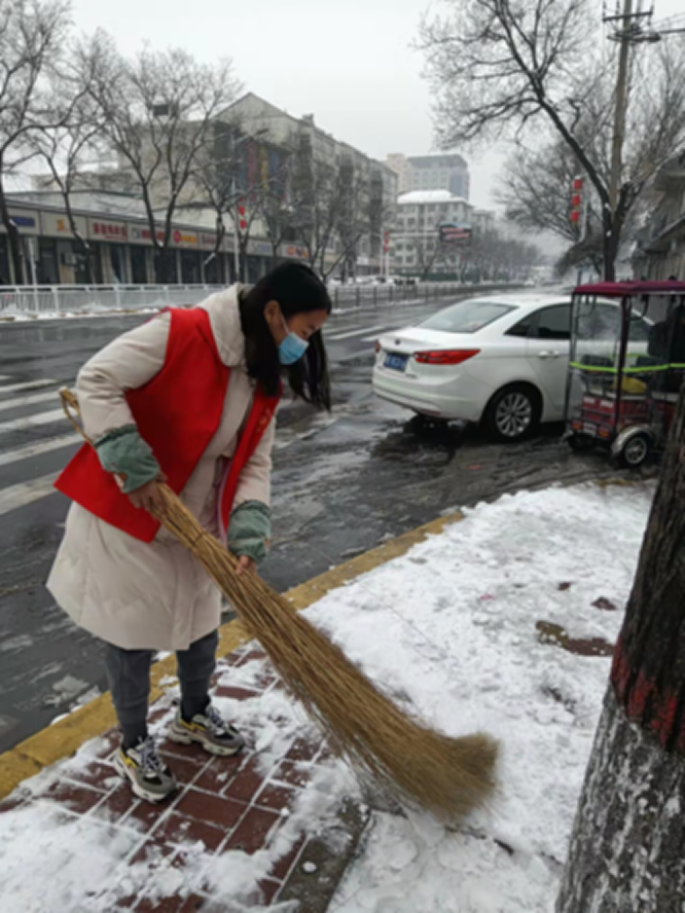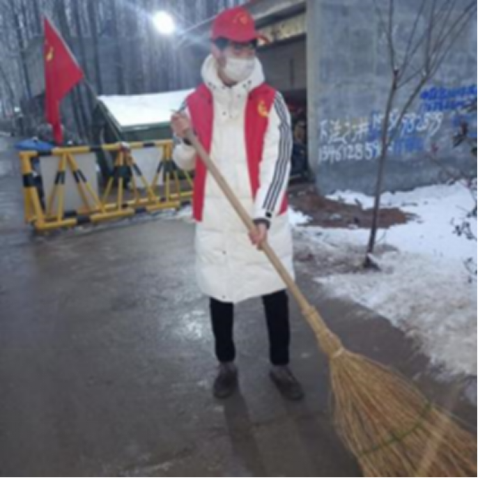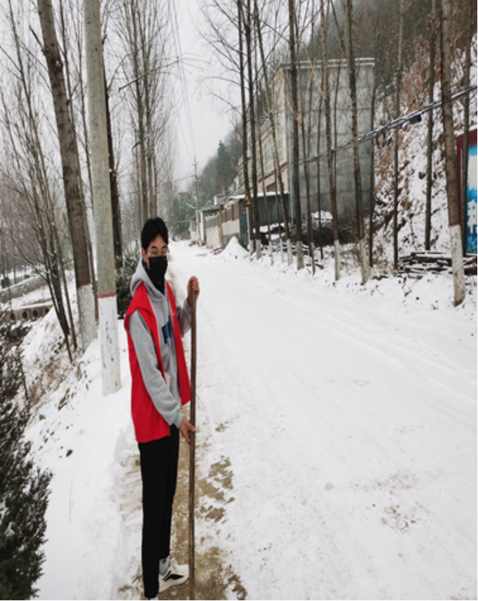 2022年1月22日,河南应用技术职业学院信息工程学院通信2001班的樊晴晴同学,在洛阳迎来了第一场雪,在欣赏雪景的同时,樊晴晴同学也注意到路面上堆积了厚厚的一层雪,已经影响到了道路交通,影响到了社区居民的正常出行,尤其是对老年人造成安全出行的隐患更大。她认为作为大学生的一员,有责任,更有义务为社会做点力所能及的事,于是她主动加入了洛阳市宜阳县白庙居民小区服务队,在1月22日下午5点跟着社区人员前往小区的道路上清扫路面积雪。她说:“虽然付出的不多,也算是为社会贡献了一点点自己的力量。”