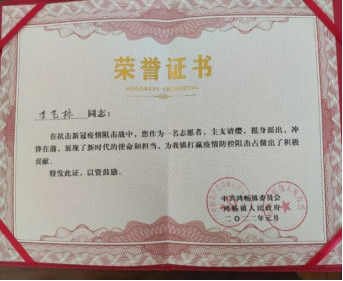 焦梦迪,女,信息工程学院计算机2103班。志愿服务内容:疫情防控相关工作。在寒假期间,她所在的城市—安阳,疫情形势日趋严峻,安阳每个市、每个县、每个乡镇都展开了一天一次的核酸检测工作,她的主要工作是在村民进去做核酸之前提前负责帮他们测量体温,维持现场秩序等。她表示:作为一名大学生我有义务积极参与防控疫情当中去。