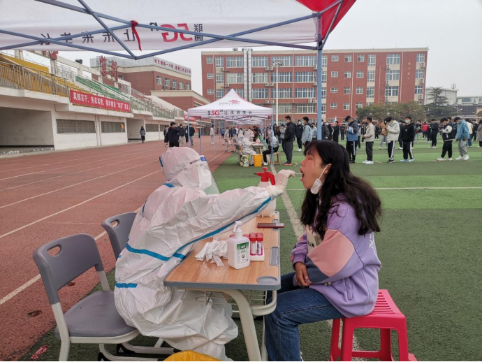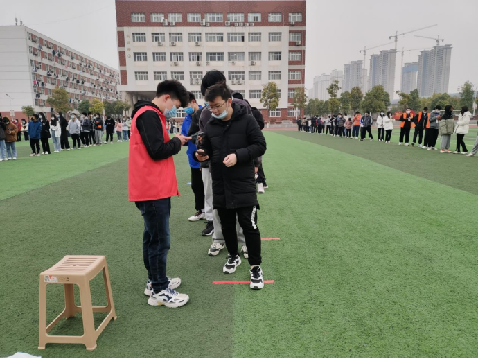 检测现场,我院志愿者按照工作方案要求,认真做好组织协调工作,提前组织同学们佩戴好口罩,到达指定位置集合,在检查预约码、查看人数等流程完成后,分批次将各班队伍带到相应位置进行核酸采集,以确保在最短的时间内完成全员检测,在和医护人员的通力合作下,大家有序检测,快速离场。