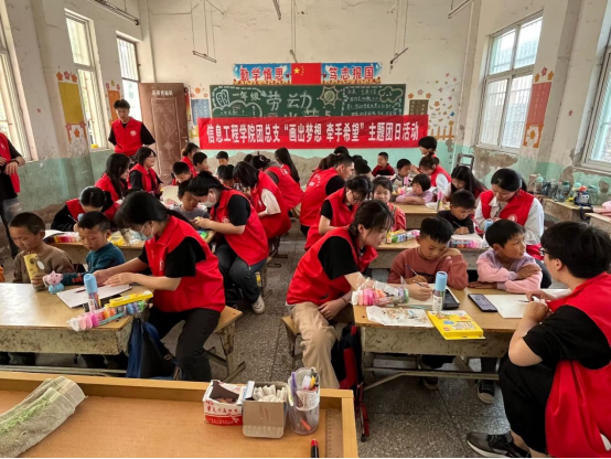为认真贯彻落实习近平总书记在主题教育工作会议上的重要讲话精神,牢牢把握“学思想、强党性、重实践、建新功”的总要求,扎实抓好主题教育,为奋进新征程凝心聚力。2023年4月19日下午,信息工程学院组织26名志愿者去往开封市祥符区罗王镇黄岗小学开"画出梦想 牵手希望"主题团日活动。