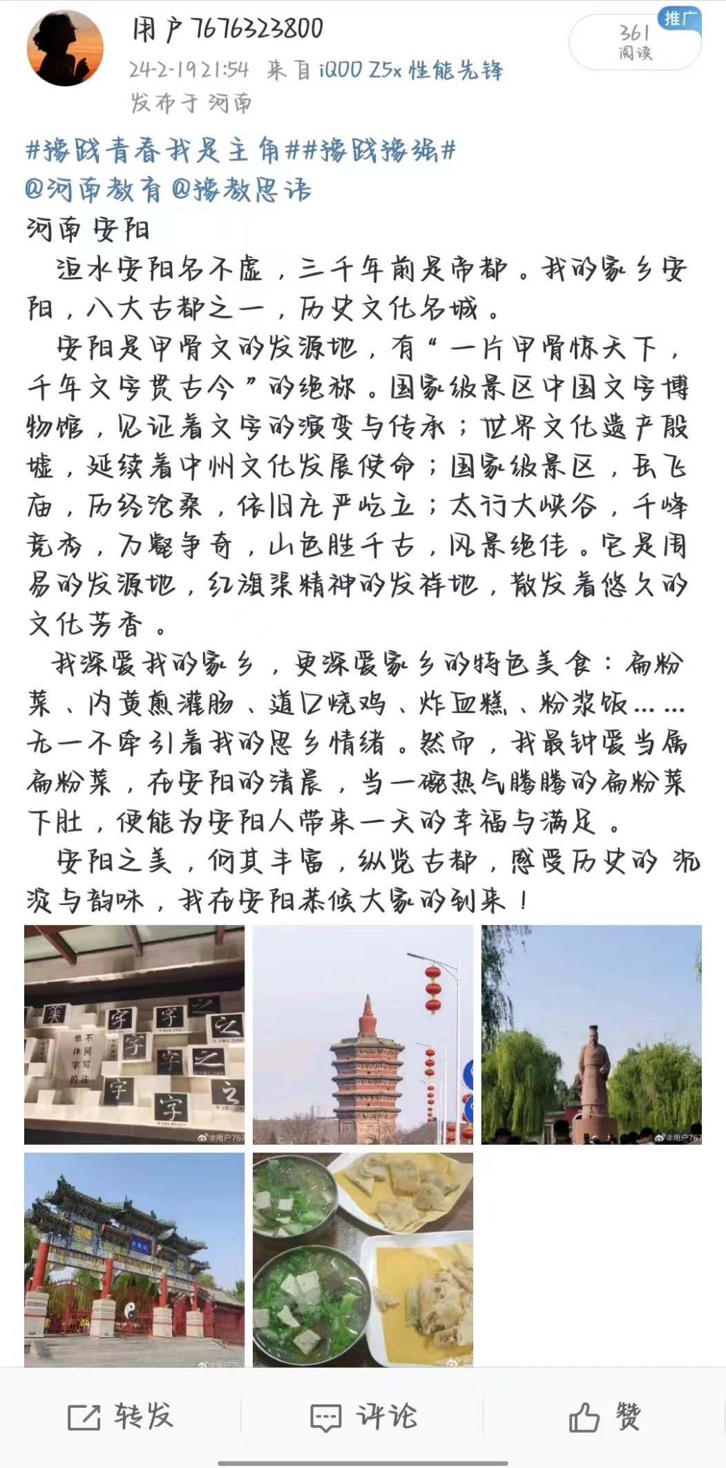为深入学习贯彻习近平新时代中国特色社会主义思想和党的二十大精神,坚持以习近平文化思想为指引,落实立德树人根本任务,充分发挥青年学生的主体地位,引导青年学子自发地融入和参与到建设现代化强国、实现中华民族伟大复兴的中国梦的广泛实践中,以实际行动积极投身新时代、奋进新征程,信工学子积极参与“豫践青春,我是主角”主题教育实践活动。