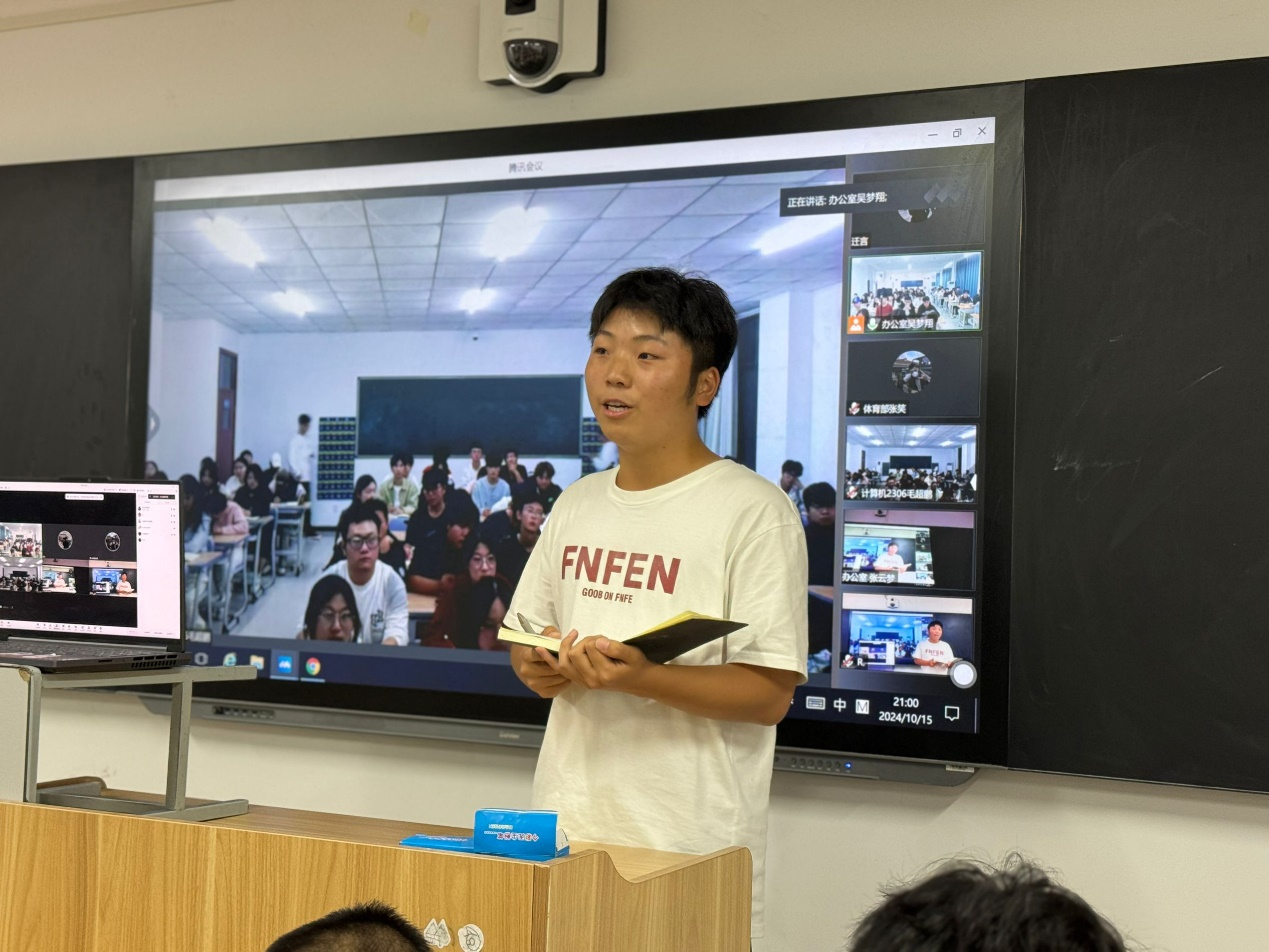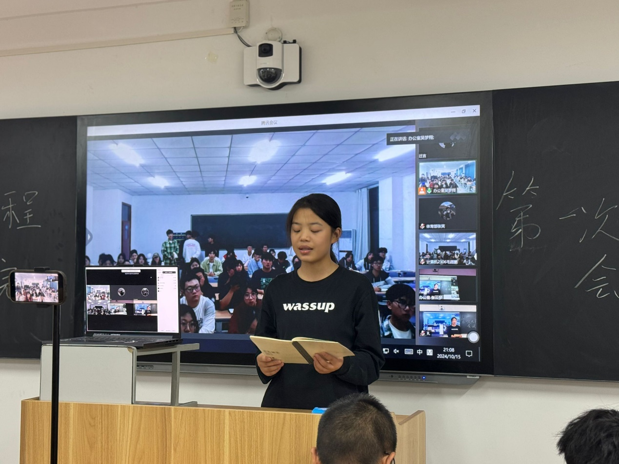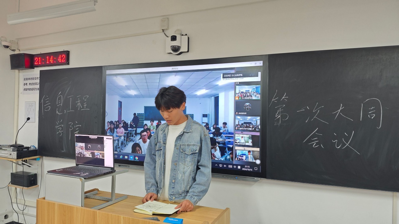 博观而约取,厚积而薄发。为有序推进学生会工作开展,提高学生会成员综合素养,帮助新成员尽快融入学生会大家庭,2024年10月15日晚,信息工程学院于开封校区F410开展学生会周例会,郑州校区于教室SC302同步开展线上会议,团总支书记冷月、学工办主任常昆、23级主席团、各部门部长、副部长及23级部员、24级部员参会。