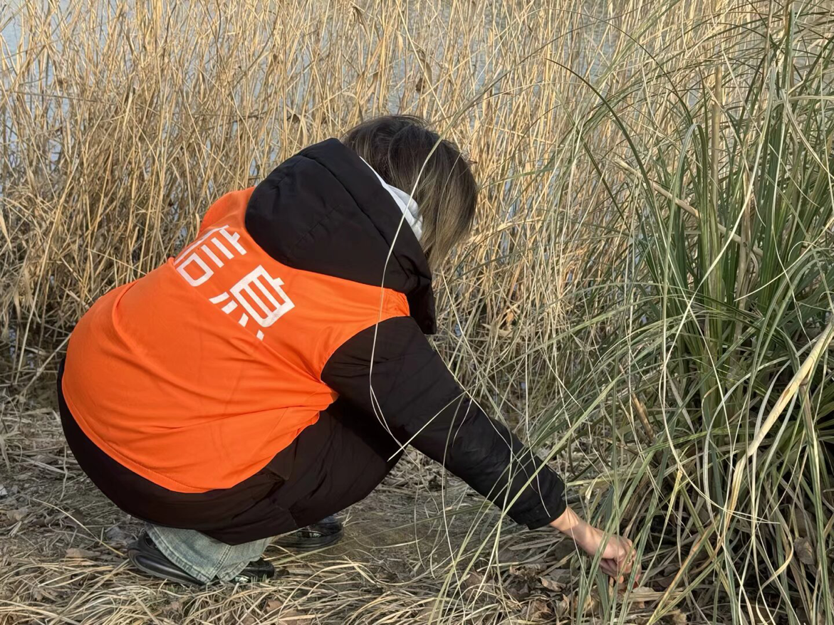 活动中,志愿者们沿着河滩行进,负责清捡河岸周边的垃圾和纸屑。