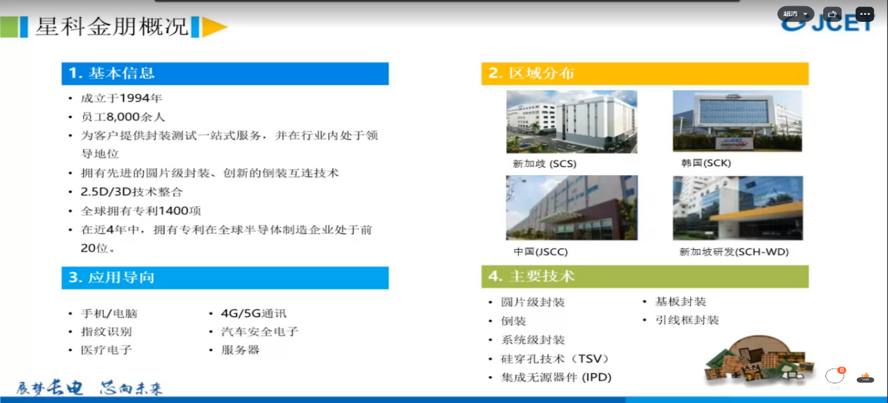 星科金朋半导体(江阴)有限公司成立于1994年,该公司主要为客户提供封装测试一站式服务,并在行业内处于领导地位,拥有先进的圆片级封装、创新的倒装互联技术,主要应用导向于手机、电脑、指纹识别、医疗电子、4G、5G通讯等方面,全球拥有专利1400项,在近4年中,拥有专利在全球半导体制造企业处于前20位。