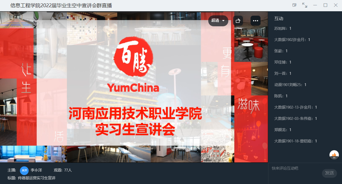 为让我校2022届毕业生了解就业行情,为毕业生提供更多的就业机会,信息工程学院空中宣讲会精彩继续放送,于5月24日特邀了中兴通讯股份有限公司招聘经理孙文心、郑州肯德基有限公司招聘经理李永洋两家企业为我院毕业生进行线上企业宣讲。