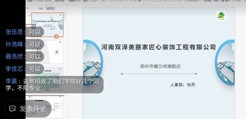 为促进用人单位做好校园招聘活动,给单位与毕业生双向选择创造便利条件,我校信息工程学院2022届毕业生“空中宣讲会”仍在继续进行。于5月26至5月27日有三家公司的宣讲人继续通过钉钉直播的方式为我院顶岗实习的毕业生们进行企业宣讲,他们分别是河南双泽美丽家匠心装饰工程有限公司招聘经理张丹、CBC信用管理有限公司河南分公司招聘经理许彦、河南博才信息技术有限公司招聘经理申举玮。