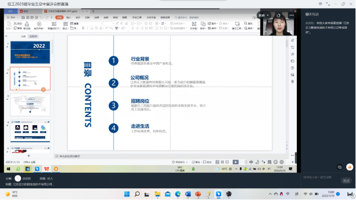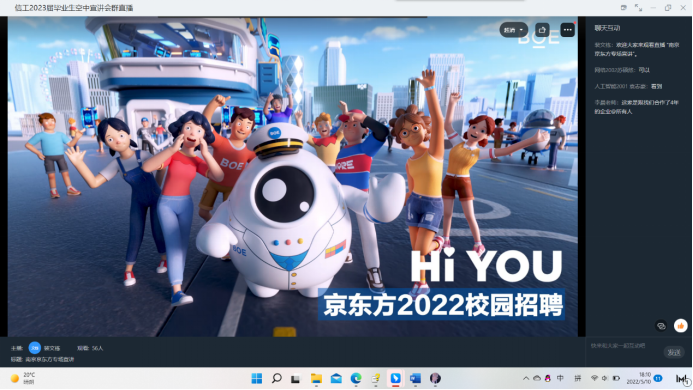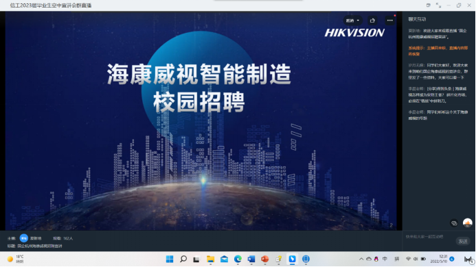 2022年5月9日至5月10日,信息工程学院邀请软通动力信息技术集团股份有限公司招聘经理刘锦经理、杭州海康威视电子有限公司招聘经理夏新培经理、江苏正力新能电池技术有限公司招聘经理洪经理、健鼎(无锡)电子有限公司招聘经理赵曼经理、南京京东方显示技术有限公司招聘经理裴文栋经理、河南八六三软件股份有限公司招聘经理张银岗经理六家公司的招聘经理通过钉钉直播的方式为同学们进行企业宣讲。