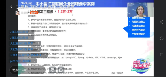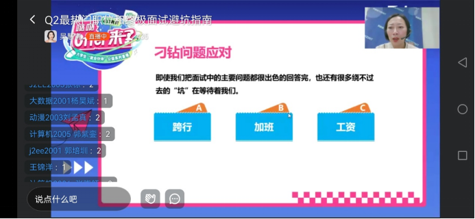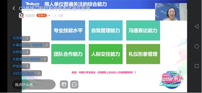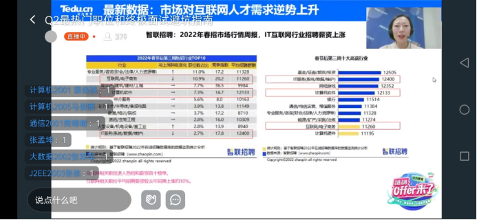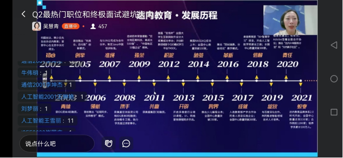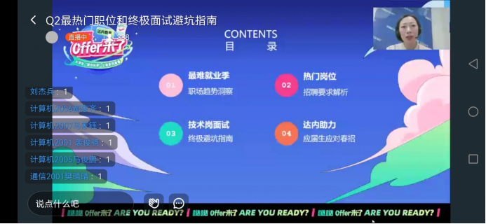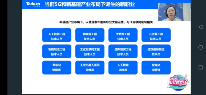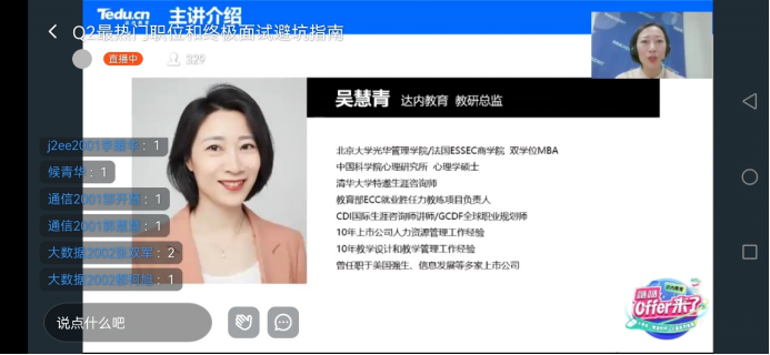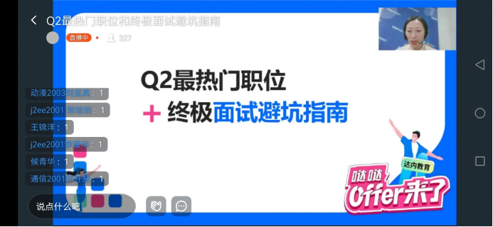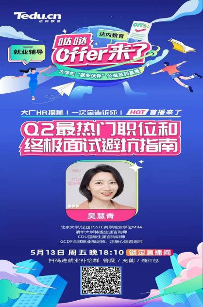 讲座中,吴慧青老师以《Q2热门职位+终极面试避坑指南》为主题,结合时下形式和自身工作经验,从最难就业季、热门岗位、避坑指南以及达内助力四个方面展开讲述。分析了目前因时代发展和疫情影响所面临的职位转换问题以及新兴最难就业季行业选择的建议。