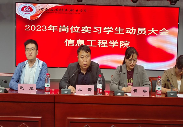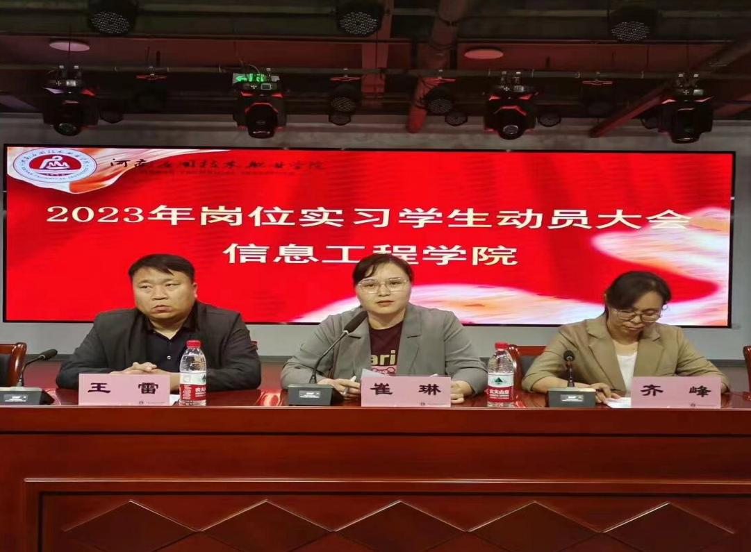 为做好学生岗位实习工作,引导学生树立正确的岗位实习观念,5月9日,信息工程学院在开封校区北院学生活动中心隆重集会,举行2023年岗位实习学生动员大会。学院院长王雷、学院总支书记崔琳、21级辅导员、实习指导教师和21级全体学生及企业代表参加大会,会议由副院长齐峰主持。