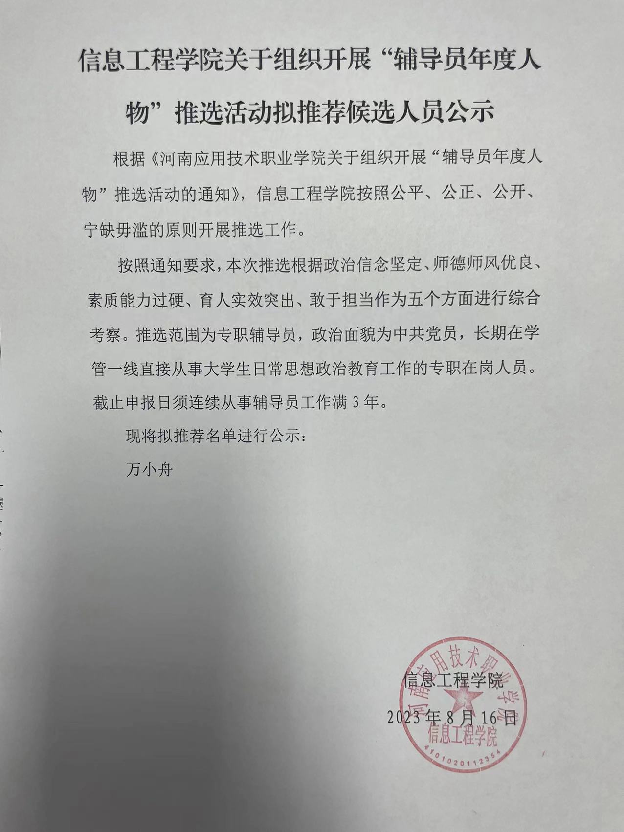 信息工程学院关于组织开展“辅导员年度人物”推选活动拟推荐候选人员公示
