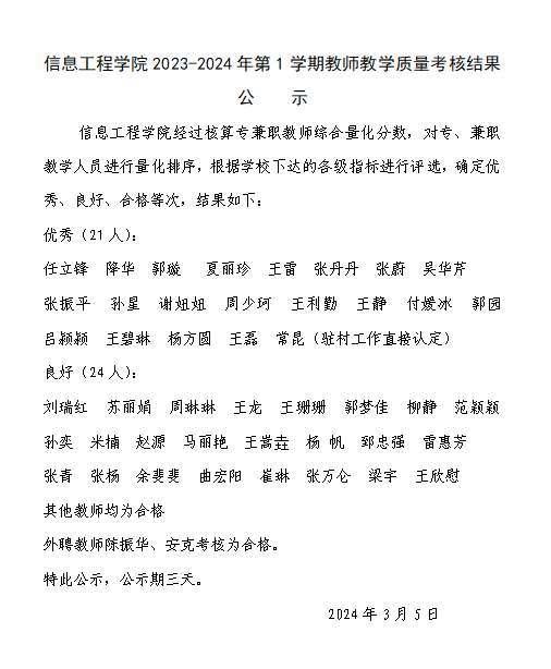 信息工程学院2023-2024年第1学期教师教学质量考核结果公示